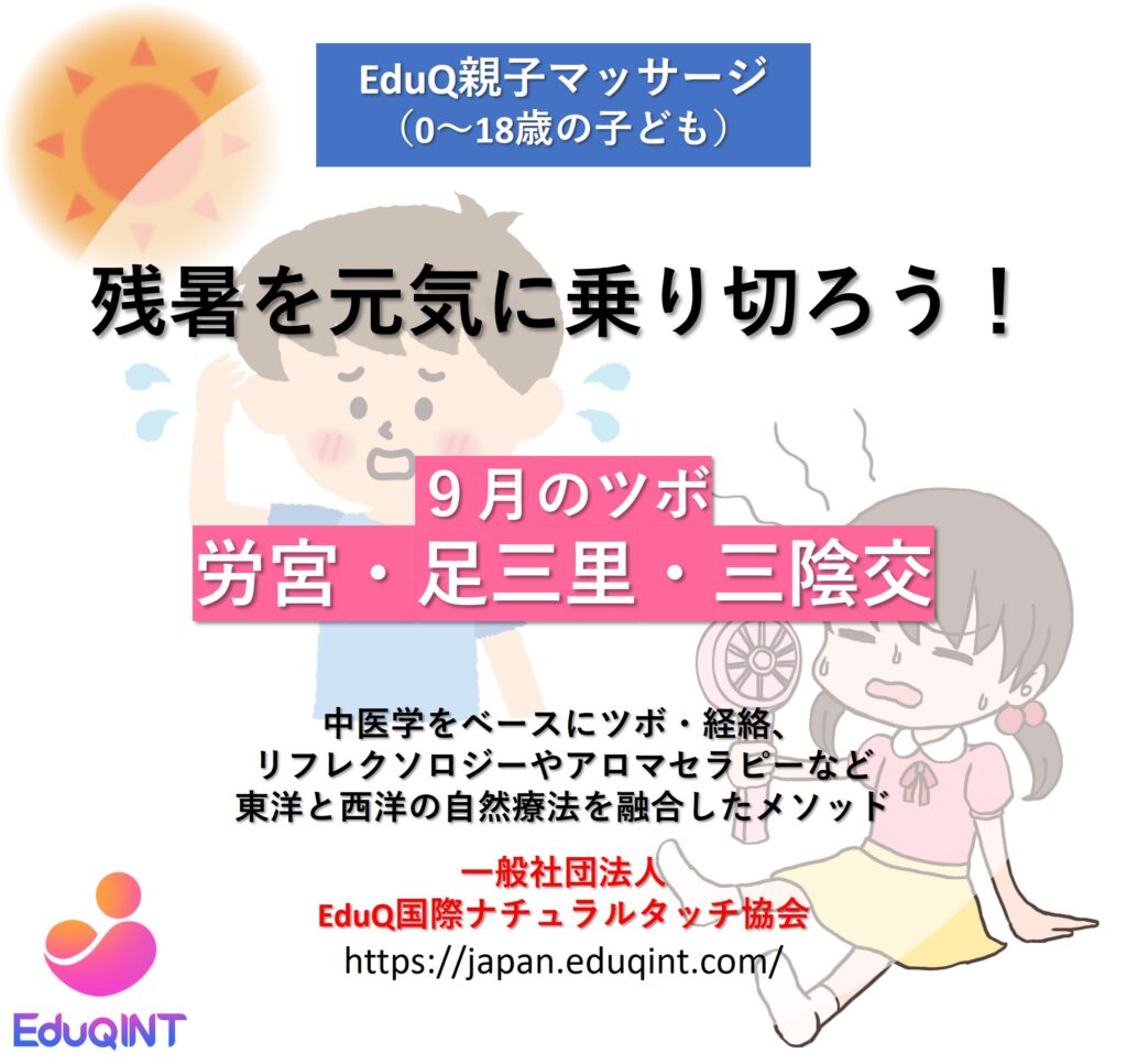 EduQでは、中医学をベースにツボや経絡、リフレクソロジー、アロマセラピー、ヨガなど東洋と西洋の自然療法を融合したオリジナルのEduQメソッでで、0歳~18歳の親子マッサージをお伝えしています。