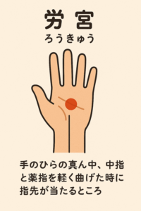 位置:手のひらの真ん中、中指と薬指を軽く曲げた時に指先が当たるところ
