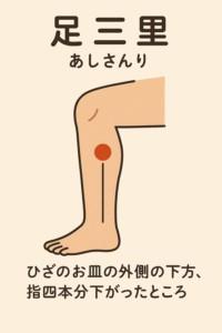 位置:膝のお皿の外側から指4本分下、すねの骨の外側のくぼみ